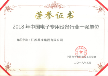 江苏苏净:荣获2018年度中国电子专用设备行业十强单位称号