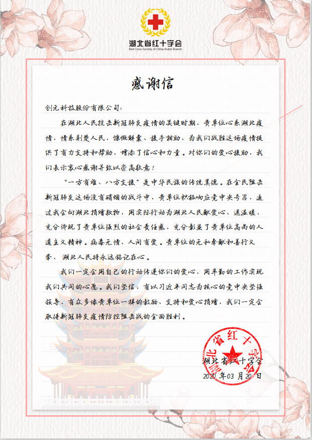 近日,公司收到来自湖北省红十字会的感谢信,信中湖北省红十字对公司在疫情期间的捐赠行为表示了衷心的感谢,并表示将会继续坚定信念,取得新冠肺炎疫情防控狙击战的全面胜利。