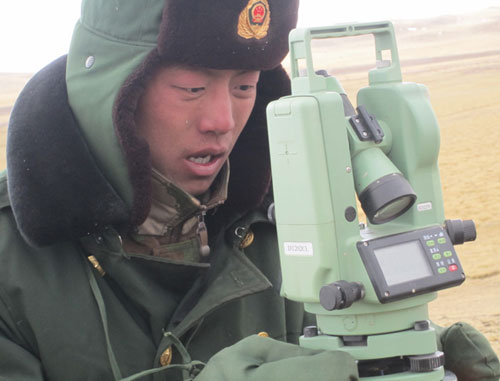 青藏联网工程建设中,武警水电部队使用公司控股子公司生产的“一光”牌电子经纬仪观测冷土施工基础沉降数据(附图)。